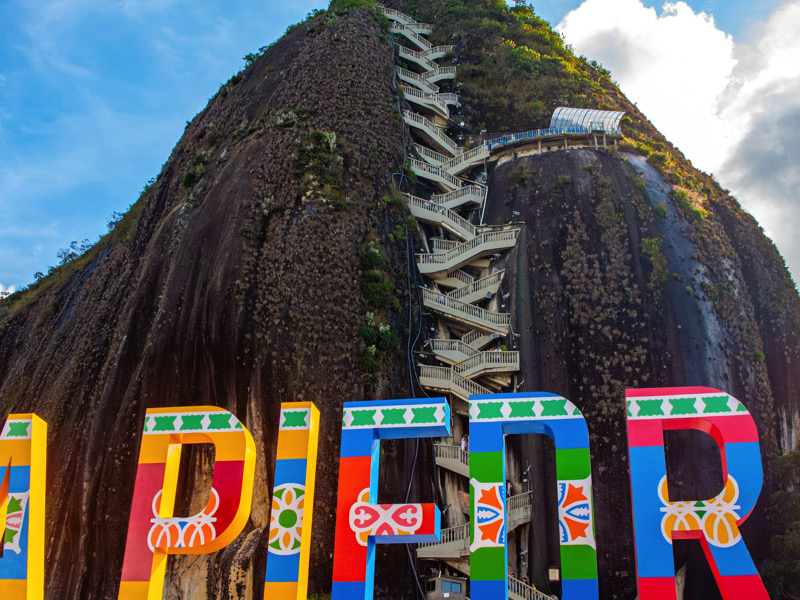 Sign with the text «La Piedra» with the peñol stone in the background in Guatape, Antioquia near the city of Medellin, Colombia