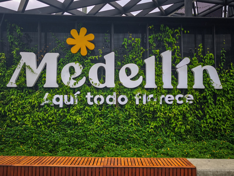 Medellin, Colombia, 10 april 2025: Iconic Medellin sign with the phrase «Aqui todo florece», displayed on a lush vertical garden wall, culture, and innovation in Colombia’s vibrant city of Medellin.