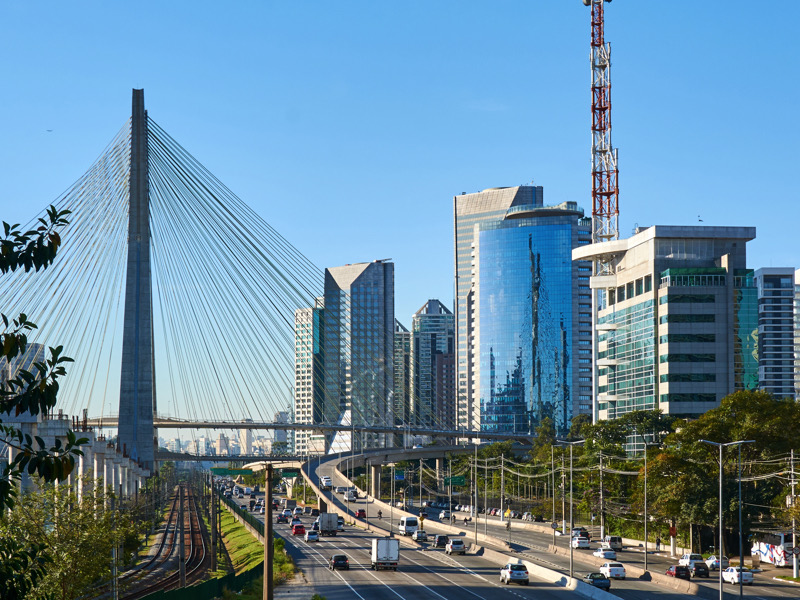 An urban cityscape with the cable-stayed bridge, traffic in Marginal Pinheiros in Sao Paulo city.