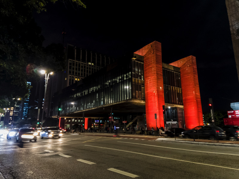 Sao Paulo, Brazil, April 28, 2023. Night view of the Sao Paulo Museum of Art, MASP, on Paulista Avenue, in the central region of the city